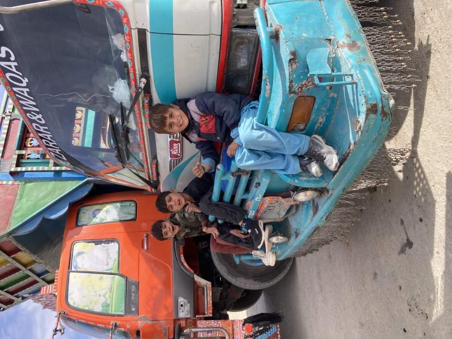 Chaman City Tehsil, Pakistan. Three pre-adolescent males are positioned on the front components of two stationary, elaborately decorated cargo trucks under daylight conditions. The leftmost truck is orange, displaying painted portraits on its cab windows and a "Hino" emblem on the front. Two boys are seated on its front tire fender and bumper. The boy furthest left wears a camouflage jacket, the middle boy a dark shirt; both exhibit open-mouthed expressions toward the viewer. The rightmost truck is predominantly white and light blue, also branded "Hino," with "ZARAR & WAQAS" visible above the windshield. A third boy, wearing a blue and grey jacket over light blue trousers, is seated on this truck's weathered light blue front bumper, which is adorned with multiple hanging metal chains. This boy is smiling directly at the viewer. The ground surface is light-colored, consistent with unpaved or concrete material. Shadows are present, indicating bright sunlight.
