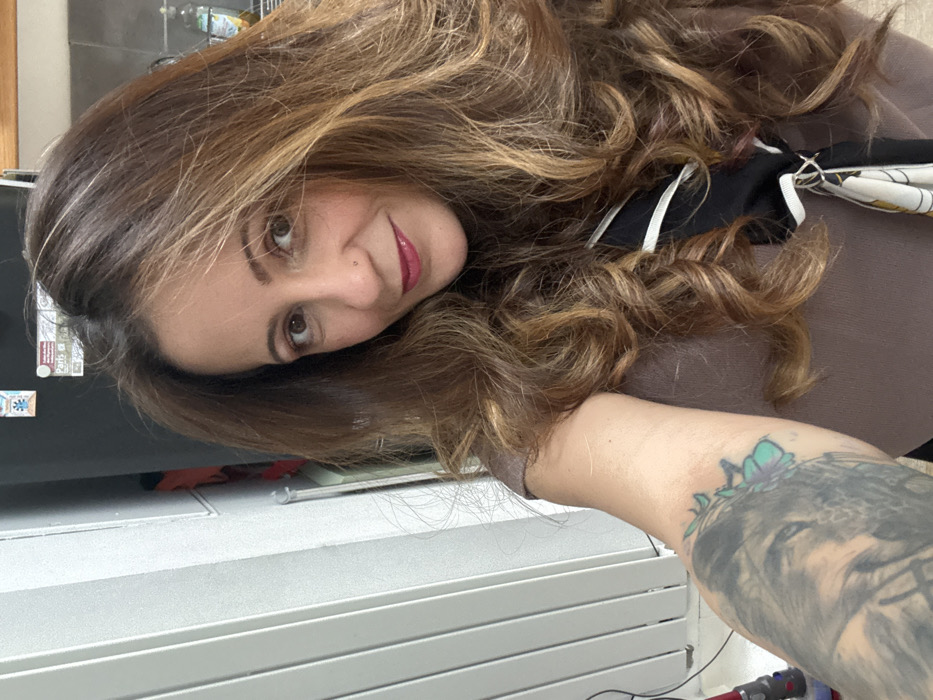 An adult female is depicted taking a self-portrait indoors in Cachan, France. The subject, positioned centrally, has long, wavy brown hair with caramel highlights and wears a light brown garment. A dark fabric element with white stripe accents is visible near her right shoulder. Her left arm, extended to frame the photograph, displays a prominent sleeve tattoo featuring a monochrome animal head, resembling a wolf or lion, partially obscured by a teal floral design near the elbow. Her facial features include brown eyes, full lips accented with dark red lipstick, and a small stud piercing on her right nostril. She maintains direct eye contact with the camera. The background depicts an interior space, consistent with a domestic residence. On the left, a light-colored vertical panel radiator is visible. The central-right background shows a dark appliance, identified as a refrigerator or cabinet, bearing a white sticker with a blue and red medical cross symbol and a magnet partially displaying the word "Paris." A wooden edge of a counter or shelf is visible above this appliance, and a yellow-capped bottle is partially visible on the far right. A red and grey vacuum cleaner is partially visible on the floor in the lower-left corner.