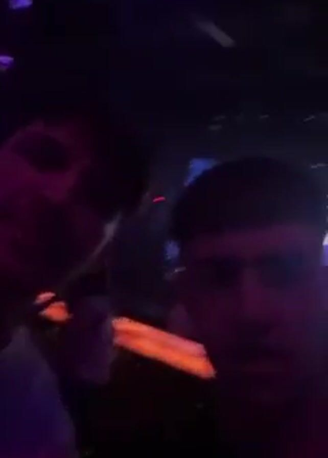 group of young people at a club or party with flashing lights and loud music. They are taking selfies and posing for the camera. Some are holding up peace signs or other gestures. There are drinks on the tables, and the atmosphere seems energetic and celebratory. The video is shaky, suggesting it was taken while the person was moving or dancing.