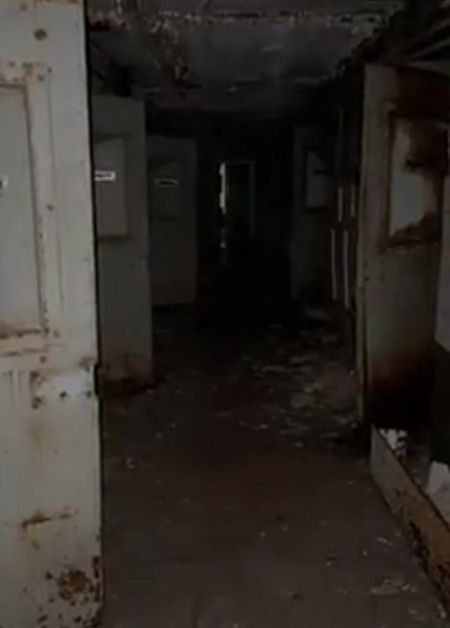The camera moves slowly down a dark, dingy hallway. On either side are open metal doors leading to small rooms. The doors and walls are covered in rust and peeling paint. Debris litters the floor. The ceiling is peeling and damaged. The hallway is very dark and only a faint light can be seen at the end.
