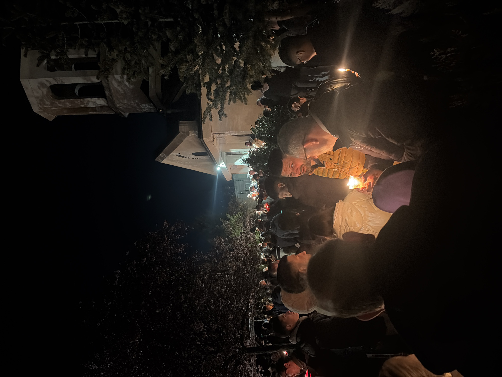 A large gathering of people are seen at night outside a church in Sofia, Bulgaria. Many are holding lit candles. The church has a bell tower and a facade with a simple cross. The crowd is densely packed together in front of the building. Trees flank the scene on either side. The image is shot at a low angle.