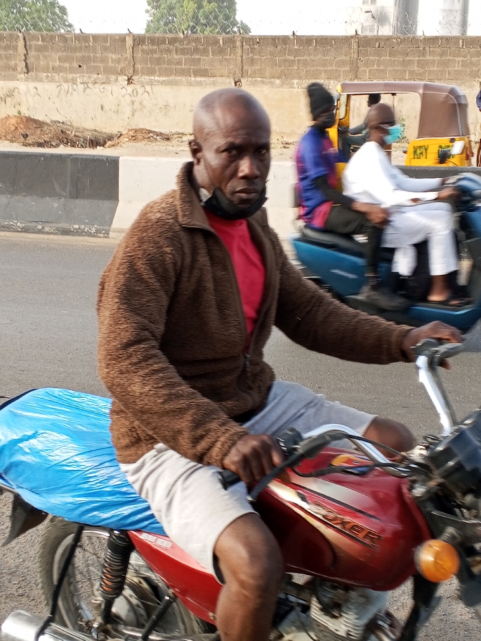 A bald man, wearing a brown jacket and red t-shirt, rides a red Boxer motorcycle. He also wears gray shorts and a black mask hangs below his chin. The seat of the motorcycle is covered in blue plastic. In the background, an auto-rickshaw with passengers can be seen. The photo appears to be taken on a street in an urban setting.