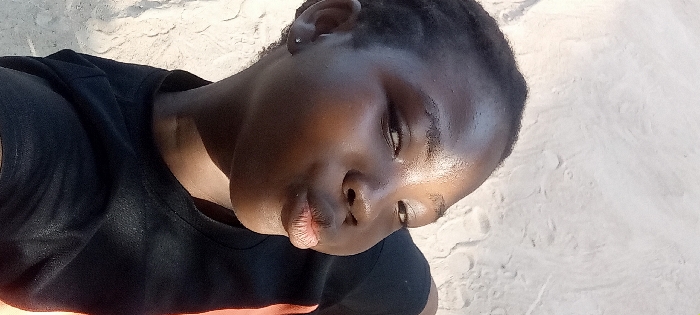 A young, dark-skinned individual wearing a black t-shirt looks into the camera. The person's head is tilted, with a gentle gaze. Light shines on their face, highlighting smooth skin. The background appears to be a sandy or light-colored surface, possibly a beach or desert. The image has a casual, relaxed feel.