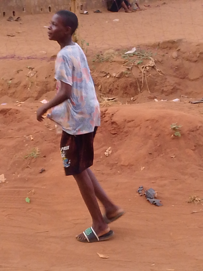 A thin boy with short hair walks across a red dirt landscape. He wears a loose, patterned t-shirt and dark shorts with the word "PRIX" visible on the leg. His feet are clad in sandals. The background includes a dirt bank with sparse vegetation and indistinct figures in the distance. Scattered debris is on the ground near the boy's feet.