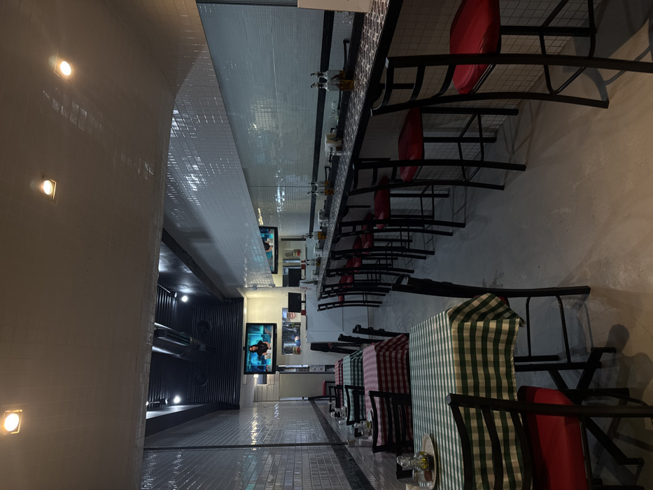 An indoor space features a long, narrow dining area with a row of high-top bar stools with red cushions along a counter. Multiple TVs are mounted on the wall behind the counter. Below, tables covered with checkered tablecloths in various colors line the opposite wall. Spotlights illuminate the area, and there's a dimly lit space at the far end with decorative elements, adding depth to the composition.