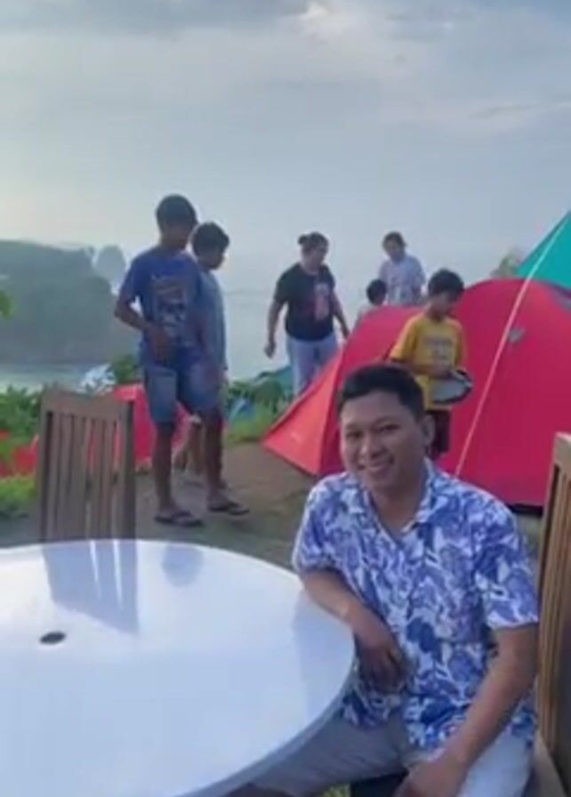 man sitting at a white table and smiling at the camera. Behind him, several people are walking around a campsite with red and green tents set up on a grassy hill overlooking a beach. The scene is set against a backdrop of a cloudy sky and ocean with rocky outcroppings. As the camera pans, a young girl walks into the frame.