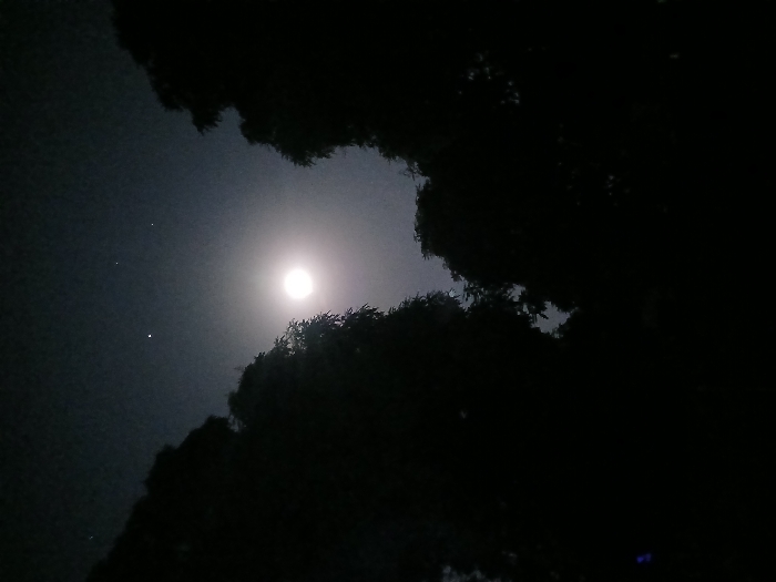 The night sky is punctuated by a bright moon, seemingly framed by dark tree silhouettes at the top and bottom of the image. Two smaller, fainter stars or planets are visible to the left of the moon. The darkness of the trees contrasts sharply with the moon's luminosity, creating a dramatic, somewhat eerie effect. The overall scene evokes a sense of stillness and nocturnal mystery.
