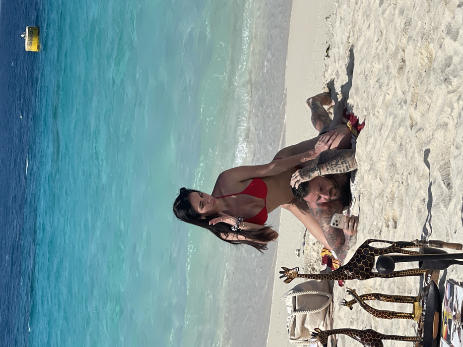 A brightly lit beach scene in Zanzibar, Tanzania, features two individuals on white sand beside clear turquoise ocean water. A female, wearing a red two-piece bikini, is seated astride a prone male with extensive tattoos on his arms and back. The male holds a light-colored smartphone in his left hand, looking at its screen, with his right hand resting on the back of his head. The female, possessing long dark hair, touches her hair with her right hand and looks towards her left. In the immediate foreground, to the left of the couple, multiple dark wooden giraffe sculptures of varying sizes are displayed on the sand, accompanied by a light-colored tote bag. A yellow buoy is visible in the distant ocean. Strong shadows are cast on the sand, indicating direct sunlight.