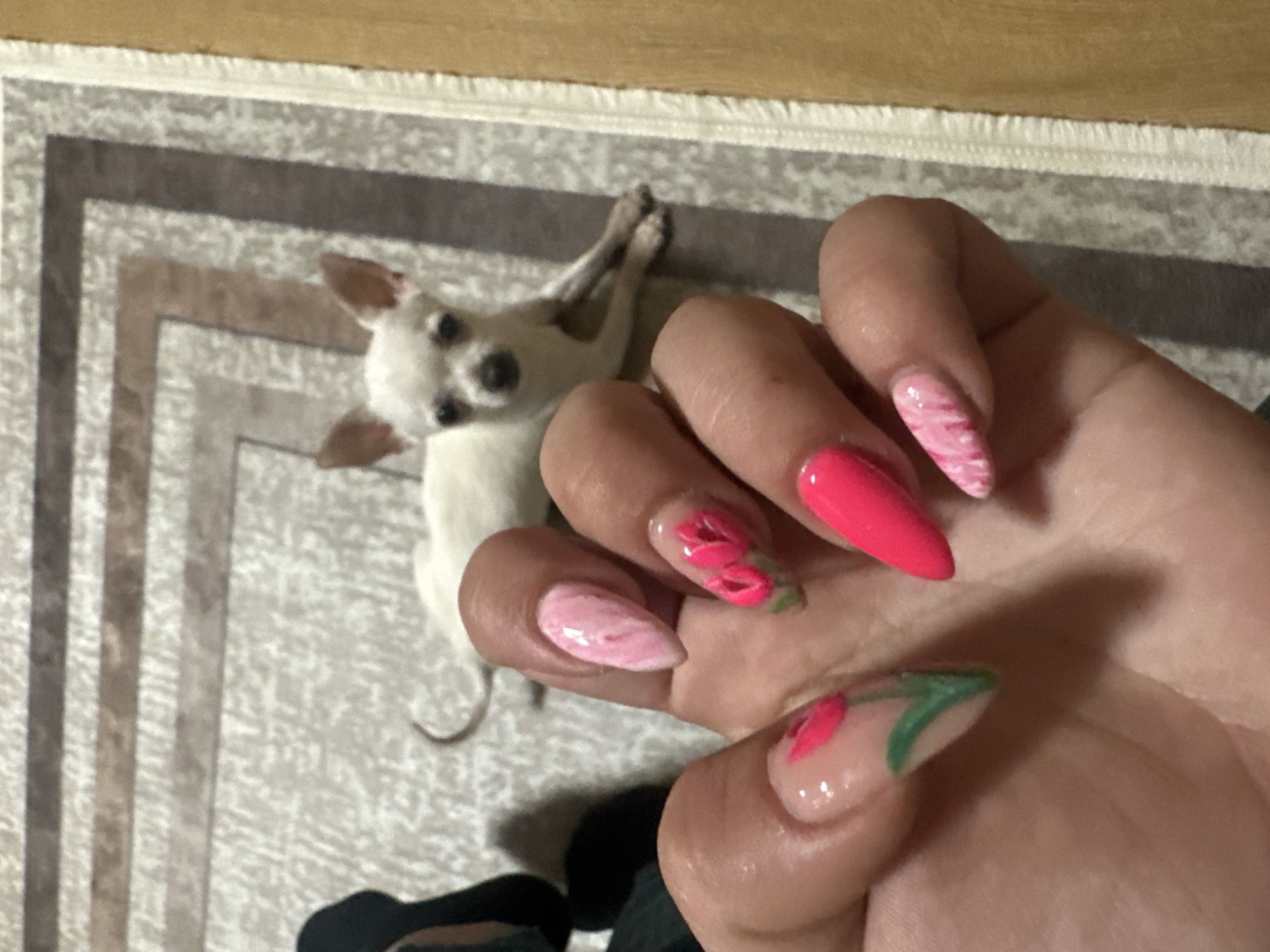A close-up, overhead shot shows a person's hand with brightly painted nails, positioned near a small white dog lying on a patterned rug. The nails are almond-shaped and feature various pink designs, including a solid hot pink color, a marble effect, and hand-painted tulip motifs. The dog is lying on its back, looking up at the camera. The rug has a geometric pattern in shades of grey and beige. A portion of the wooden floor and black clothing is visible. There is no evidence that this image was taken in Skala, Bulgaria.