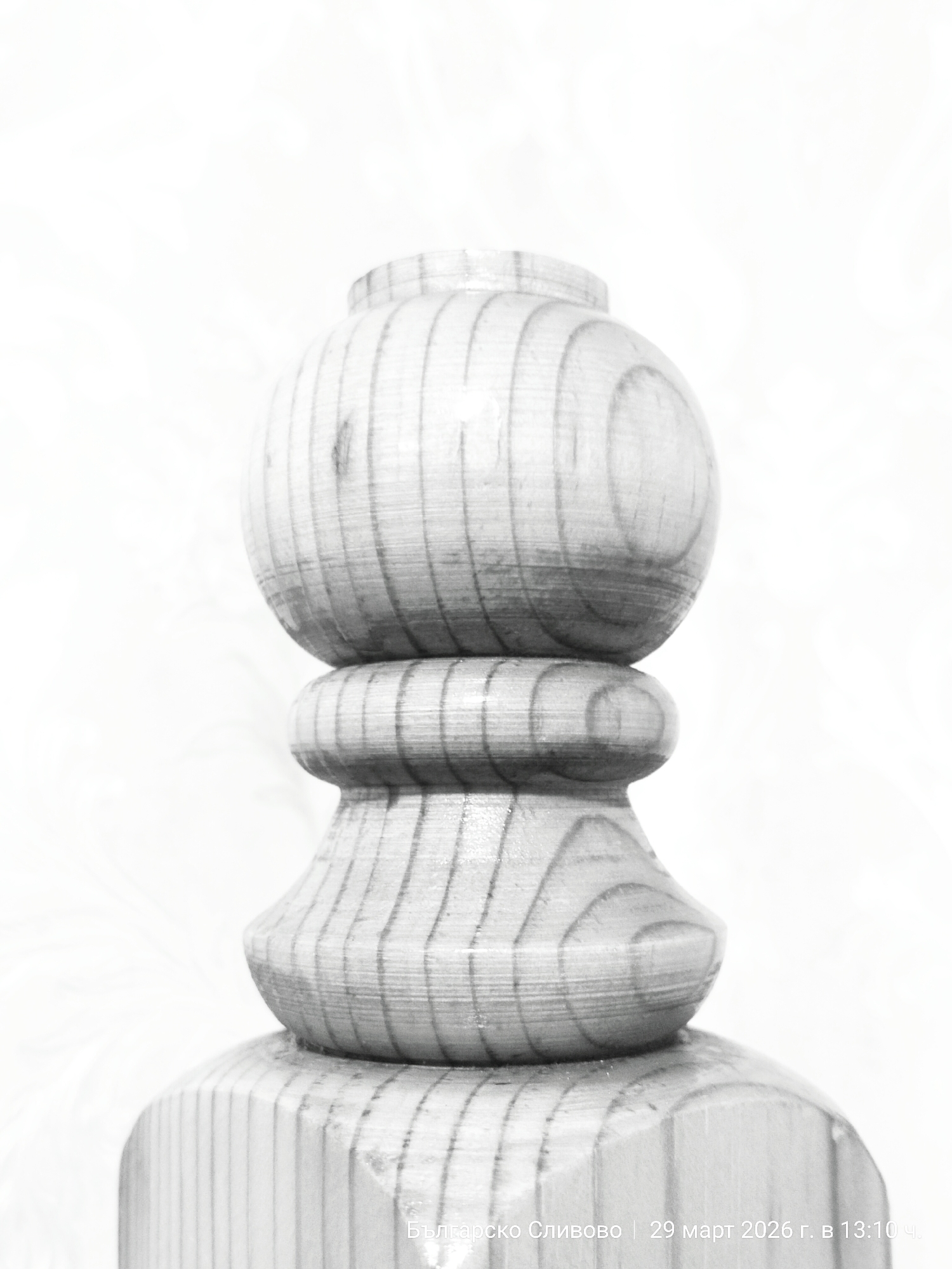 A close-up, black and white photograph depicts a turned wooden object, likely a table leg or decorative element. The object is composed of several distinct shapes: a rounded ball at the top, a cylindrical section, followed by a bulbous, flared section, and a more substantial cylindrical base. Wood grain is prominently visible. The background appears to be a blurry, light-colored surface. Text at the bottom reads: "Българско Сливово | 29 март 2026 г. в 13:10 ч.", which translates to "Balgarsko Slivovo | March 29, 2026 at 13:10". This indicates the photograph was taken in the town of Balgarsko Slivovo, Bulgaria. The time is indicated using the 24-hour clock.