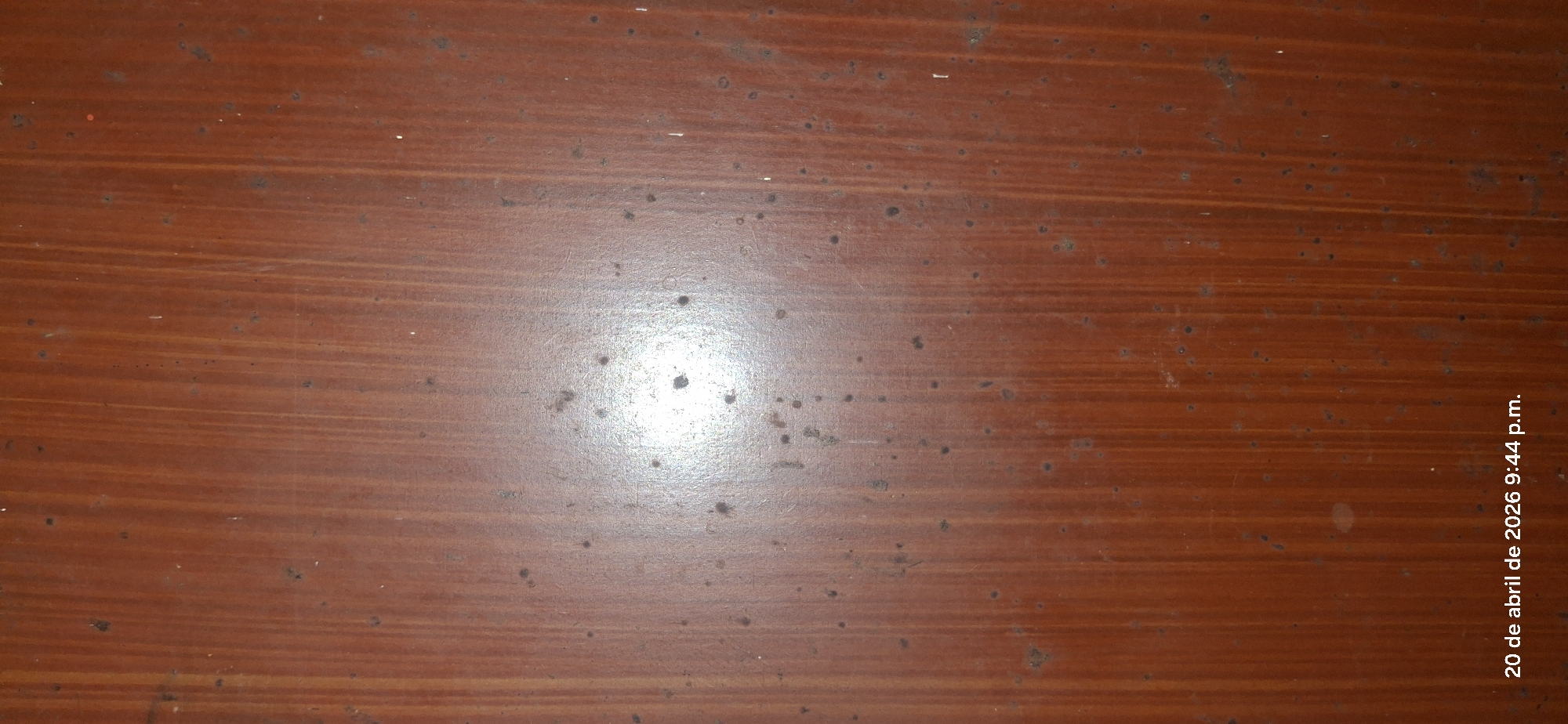A slightly reflective wooden surface with visible horizontal grain. The color is a rich, warm reddish-brown, punctuated by numerous small dark spots, scratches, and a brighter, circular glare near the center. "20 de abril de 2026 9:44 p.m." is printed in white text along the right edge. The overall impression is of a well-used, vintage table top or other wooden furniture surface.