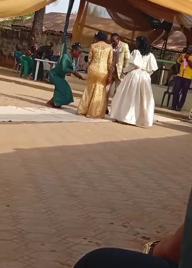 man dancing with three women in an outdoor setting with a tent covering the dance area. The man is wearing a light-colored suit, one woman is in a gold dress, another in a white dress, and the third is in a green dress. All four of them are dancing on a brown, patterned floor. In the background, there are people sitting at tables. A man in a yellow shirt appears to be playing an instrument. The camera seems to be held by someone sitting down, as part of a chair is visible at the bottom of the frame.