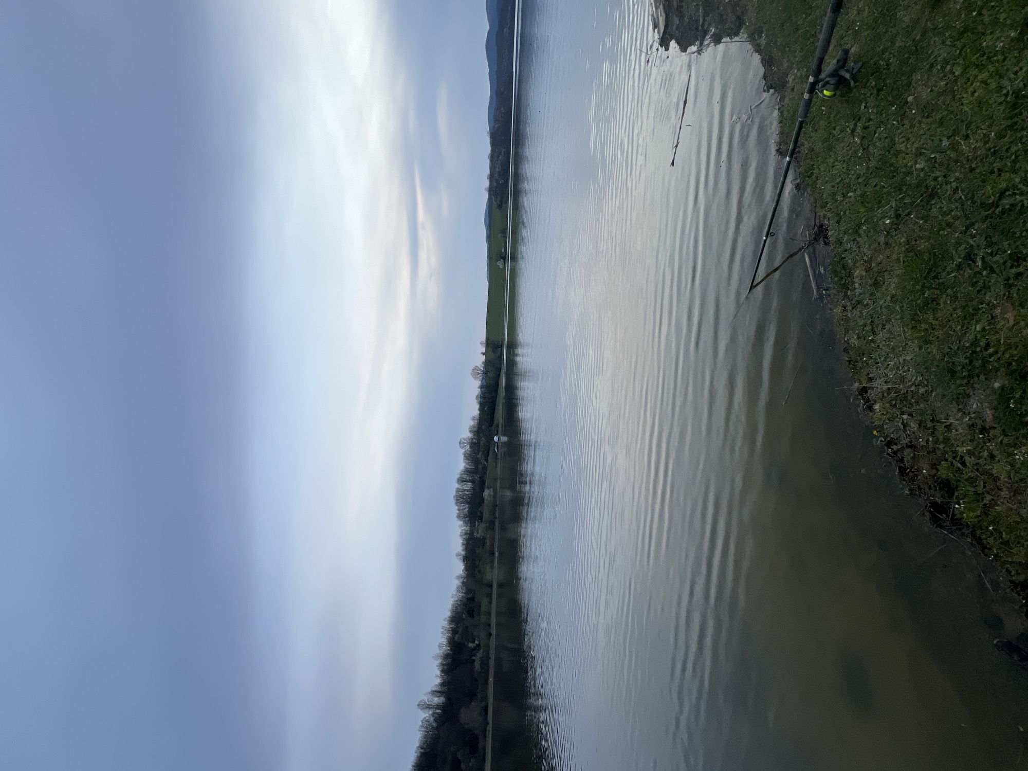 The image depicts a body of water, possibly a lake or wide river, in Valchovtsi, Bulgaria. The water has subtle ripples. The shoreline is visible on the right, covered with green grass. Fishing rods are set up along the bank. On the opposite side of the water, a line of trees and distant hills define the horizon. The sky is overcast with light clouds.