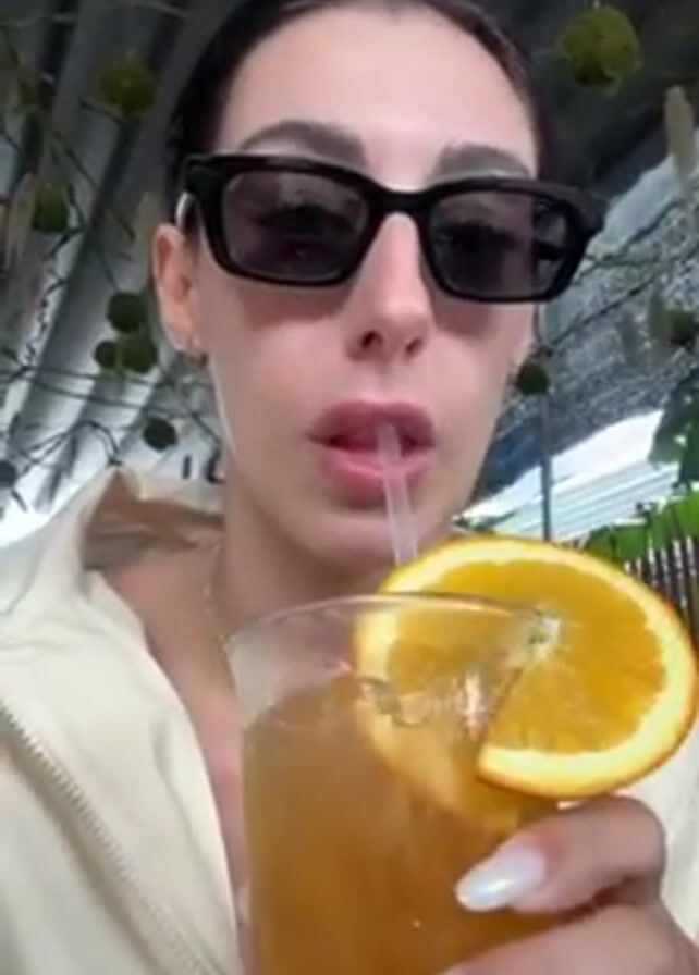 A woman wearing sunglasses and a cream-colored jacket drinks from a glass with a straw, topped with an orange slice. She's indoors, possibly in a sunroom or greenhouse-like area, judging by the plants and hanging decorative moss balls in the background. The woman holds the glass with a hand sporting long, light-colored nails. She appears to be enjoying her drink, taking sips while looking at the camera.