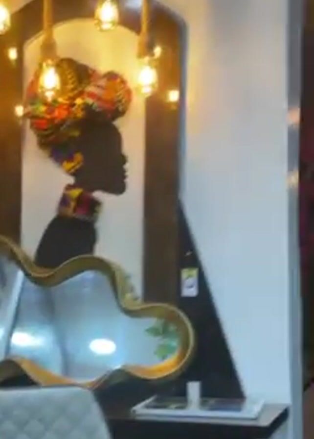 interior of a restaurant or cafe. A black and white silhouette of a woman with a colorful headwrap adorns the wall above a uniquely shaped mirror. The mirror has a gold frame and is positioned on a small table. Above this arrangement hangs a decorative light fixture with several exposed bulbs. Two chairs, one black and one white with a quilted pattern, are placed near the table. A person wearing a pink shirt and a baseball cap enters the frame carrying a small box. The person moves around the room, their actions are not clearly discernible. Artificial pink flowers are visible in the background.
