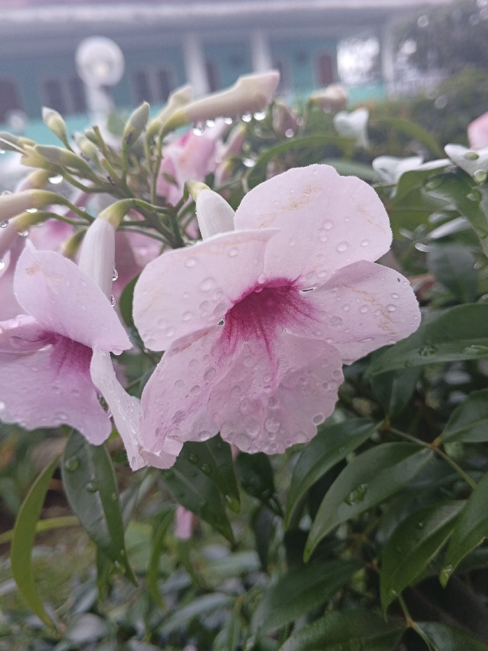 Pale pink flowers with magenta centers glisten with raindrops amidst lush green foliage. The petals are delicate and slightly translucent, showcasing the vibrant inner hues. Droplets cling to the leaves, adding a fresh, dewy quality to the scene. The background reveals a blurred building, hinting at a garden setting. The soft light accentuates the gentle colors and highlights the textures of the petals and leaves.