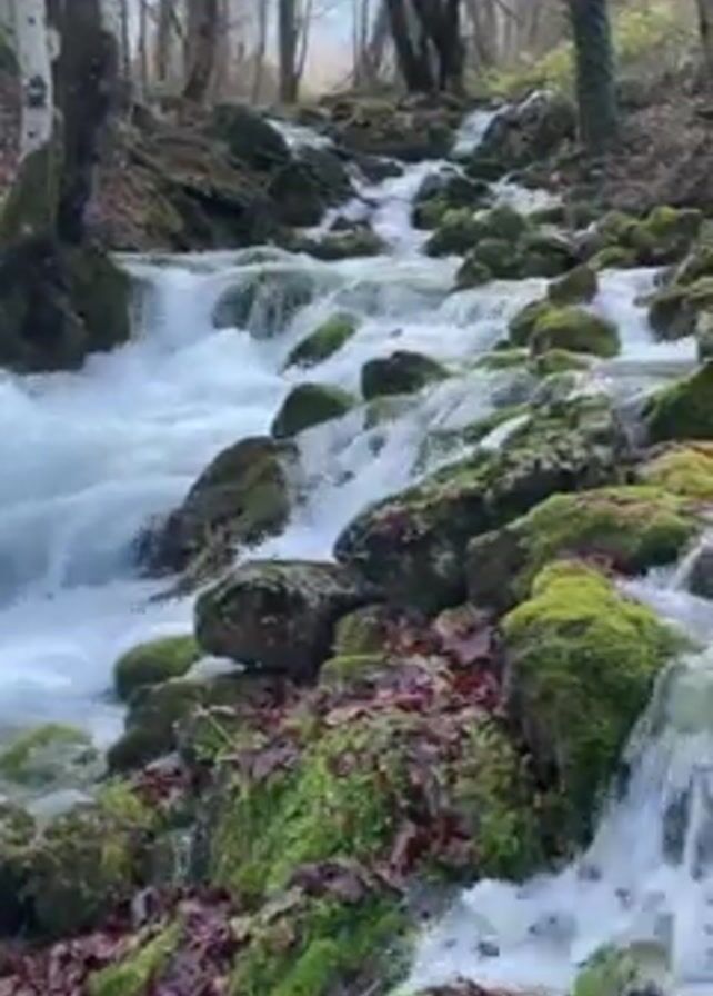fast-flowing stream cascading over moss-covered rocks. Bare trees line the background. Fallen leaves litter the ground near the water.