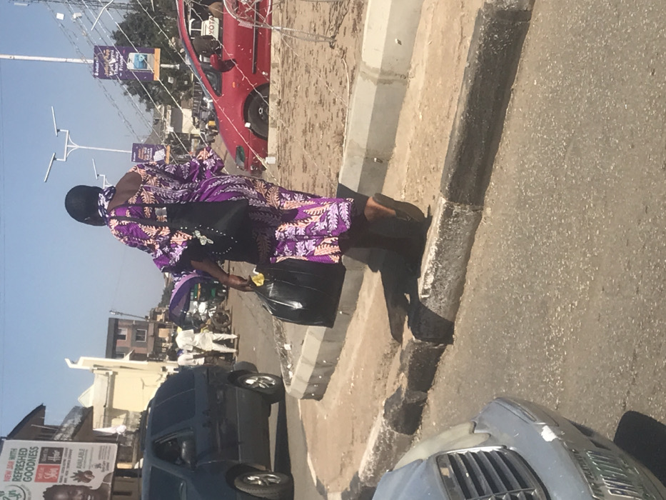 A woman in a purple patterned dress and black shoes walks along a sidewalk next to a road. She carries a black handbag and a black plastic bag. Cars are visible on the road, including a red car partially obscured by wires and a silver car in the foreground. A dark-colored car is parked nearby. Buildings and street signs are also visible in the background. The scene appears to be a busy street during the day.