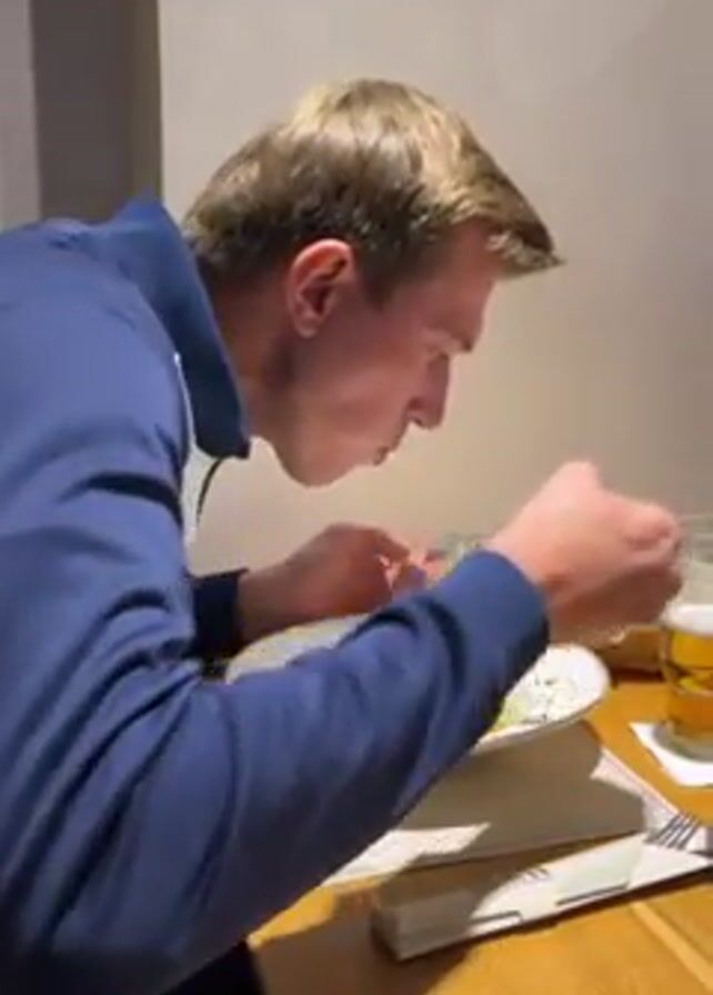 A man is shown eating a bowl of soup at a wooden table in a restaurant. He is wearing a blue and white long sleeve shirt. After taking a bite, he picks up his smartphone and takes a photo of the soup. Other items visible on the table include a basket of bread, a glass of beer, and silverware. The walls of the restaurant are plain.