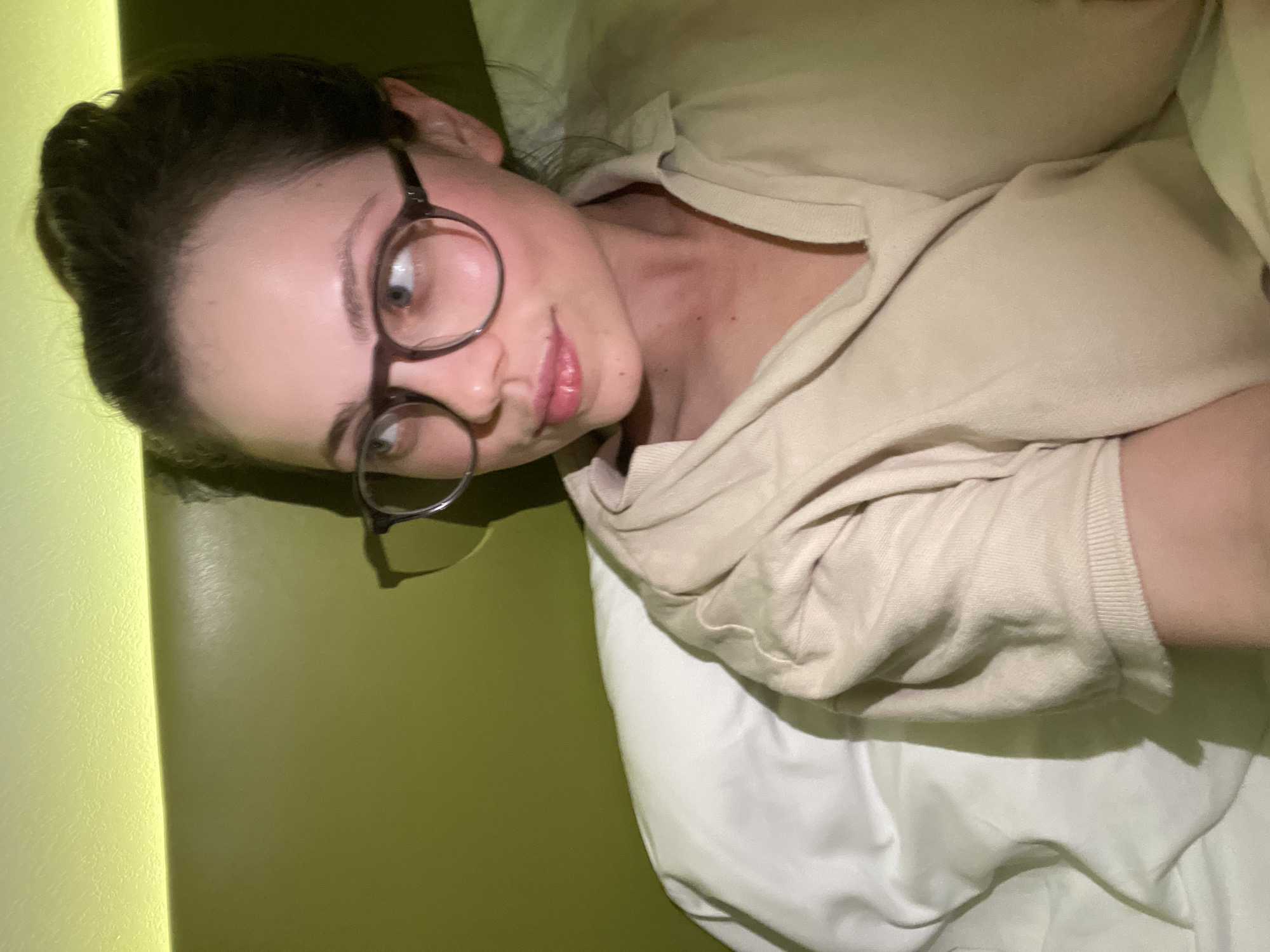 - "A young woman with dark hair pulled back in a bun and wearing round glasses lies sideways on a bed covered in white sheets and a beige sweatshirt or light sweater" by FM-4OCh93, licensed under CC BY 4.0
