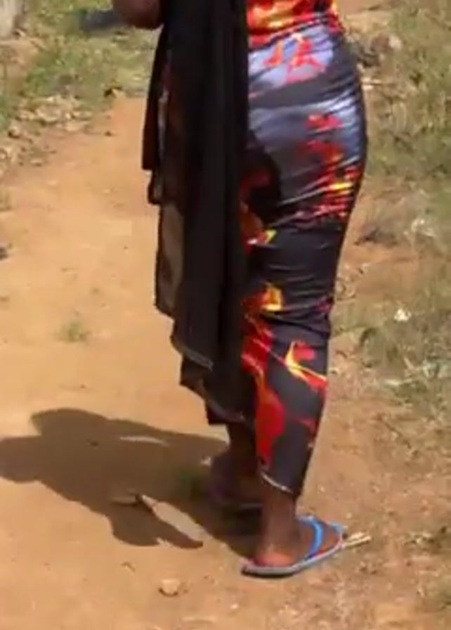 A woman is walking away from the camera on a dirt path. She has a black scarf over her left shoulder. She's wearing a red, yellow, black, and grey patterned tank dress that goes down to below her knees. She's wearing blue and pink flip-flops. The path has green grass and trash on either side.
