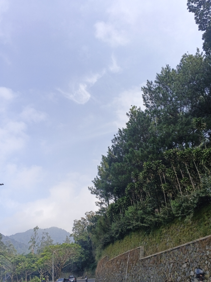 The image displays a daytime scene in Basedth, Cambodia. The upper two-thirds of the frame consist of a light blue sky with scattered white, wispy clouds. The right side of the image is dominated by a steep, green hillside densely covered with vegetation, including tall, coniferous trees at the top, a layer of slender trees with distinct foliage below them, and various shrubs. Towards the bottom right, a stone retaining wall constructed from irregular grey and brown rocks runs along the base of the slope, with a band of reddish-brown earth visible above it. This wall borders a paved, dark grey road that curves to the left across the lower half of the image. On the road, several vehicles are present: a dark-colored car is visible on the left side, with another dark vehicle further back. On the far right, partially cropped, a motorcycle is visible with a helmeted individual operating it. In the mid-ground, on the left side, a white street light pole with an extended arm is present. Distant, hazy green mountains are visible on the left horizon, beneath the sky. The overall environment is mountainous and heavily vegetated.