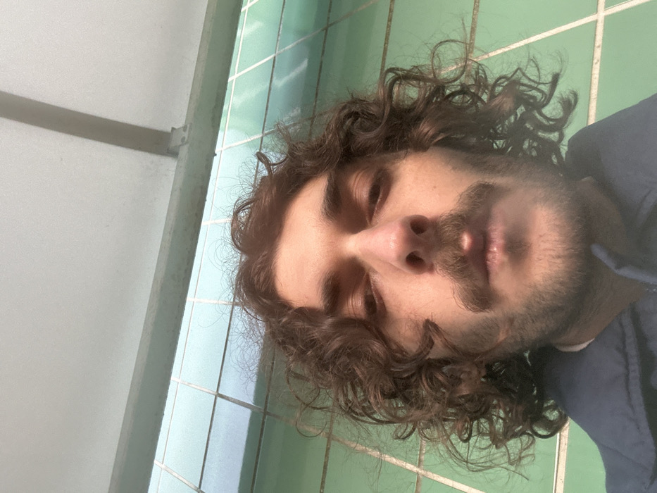 A person with wavy brown hair, a mustache, and stubble tilts their head downward, looking at the camera. The background features light green tiled walls and part of a white structure with a metallic bar. The individual wears a dark blue jacket. The angle of the shot is unconventional, giving a slightly distorted perspective of the face.