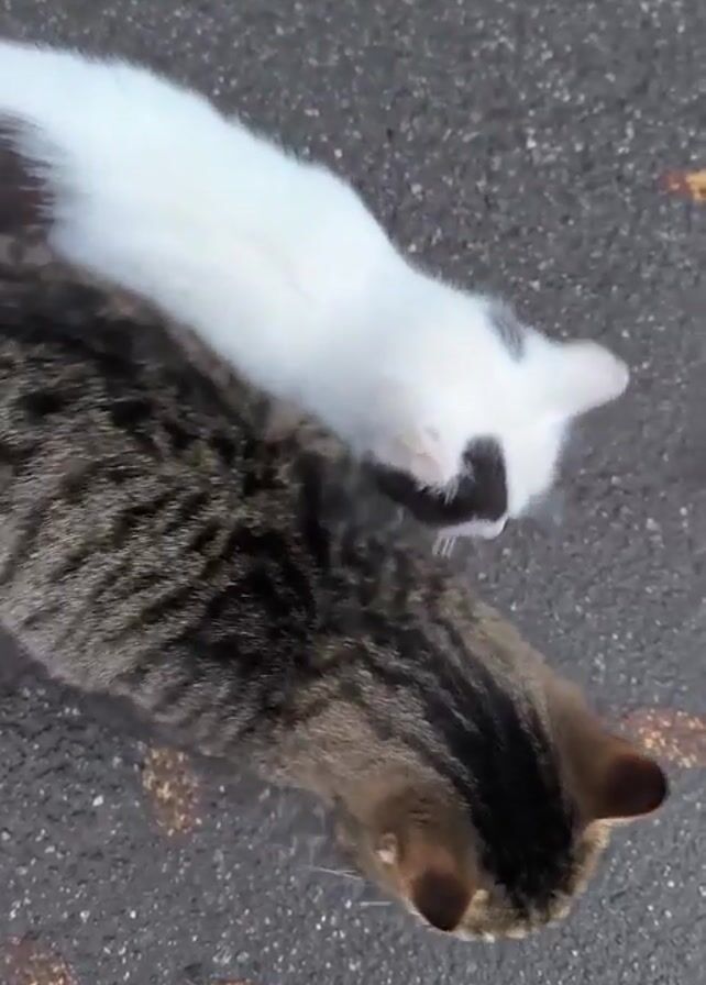 Two cats, one tabby and one white with black spots, are on a gray asphalt surface