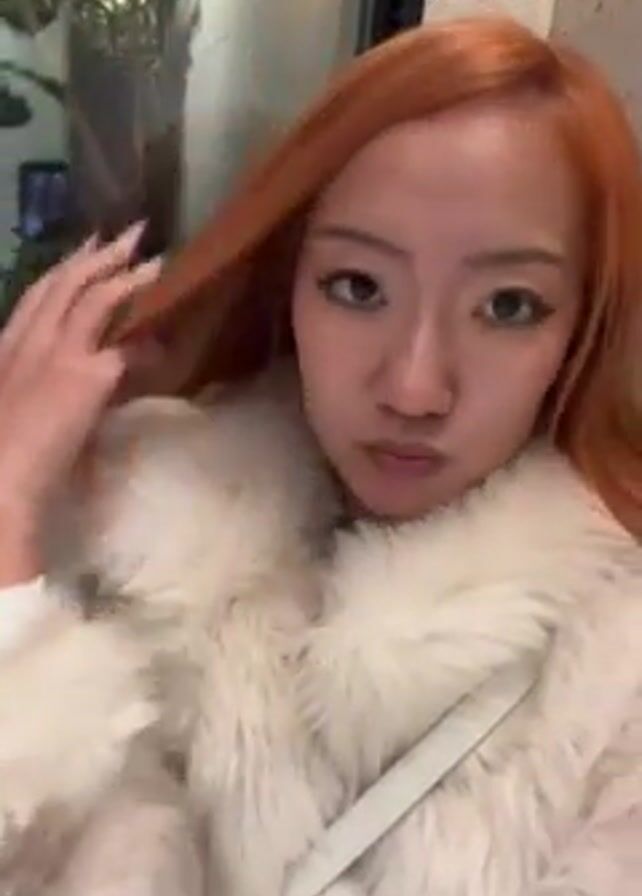 A young Asian woman with bright orange hair stands in front of a window, wearing a white fur jacket