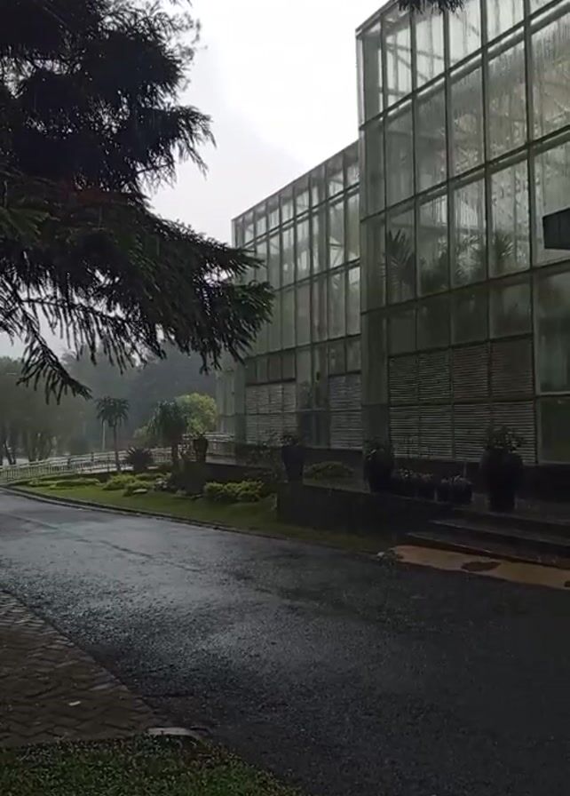 rain-soaked scene outdoors. A large, modern building with a glass facade is partially visible on the right. The glass panels appear wet from the rain. In front of the building, there are several potted plants arranged along a raised area. A wet asphalt road leads towards the building, with a grassy strip running alongside it. On the left, a portion of a pine tree frames the view, its branches extending into the sky. The sky is overcast. The scene depicts a quiet, rainy day in what seems to be a botanical garden or park setting.