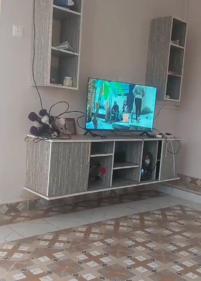 living room or entertainment area with a tiled floor and a TV mounted on a wall-mounted cabinet. The floor has a pattern of brown, tan, and white tiles arranged in a geometric design. On the wall, there is a grey-colored wall-mounted TV cabinet with shelves and closed storage. A television is on the cabinet, displaying a scene from a show or movie. There are two tall, narrow shelves on either side of the TV, also mounted on the wall and matching the cabinet's grey color. A few decorative items sit on the shelves of the cabinet, and there's a computer tower visible inside one of the cabinet sections. The walls are a light neutral color. Electrical outlets and wires are visible on the wall. The lighting appears to be a combination of natural and artificial.