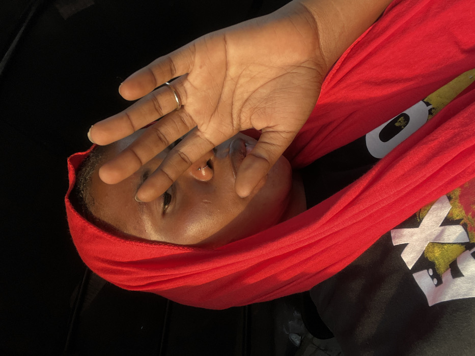 A single individual, appearing to be an adult female with a dark complexion, is depicted in a medium-close-up against a dark, indistinct background. The individual wears a red head covering that drapes over the head and neck, and a black t-shirt with a partially visible graphic displaying white letters "EX." The person's right hand is raised with the palm facing the camera, obscuring the right side of the face from the nose downward. A plain silver-colored ring is present on the ring finger of the right hand. A small silver hoop nose ring is visible on the individual's left nostril. The subject's left eye is visible, cast downwards. Strong, warm-toned directional lighting from the right illuminates the right side of the face, the raised hand, and portions of the red head covering, creating defined highlights and shadows. No specific visual cues are present in the image to determine the exact location within Lokoja, Nigeria.