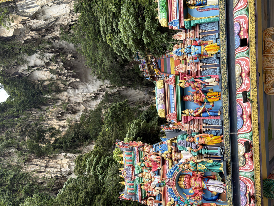 A vibrant, ornately decorated Hindu temple structure stands in contrast to a rocky cliff covered in lush greenery. The temple facade features numerous colorful deities and intricate patterns. The natural landscape of the limestone cliffs and dense vegetation provides a striking backdrop to the man-made religious site. The composition highlights a blend of cultural and natural elements.