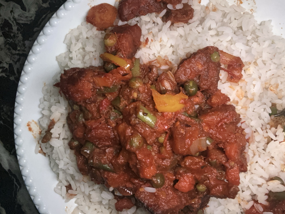 A white plate brimming with white rice is partially visible, taking up most of the space. Atop the rice, a generous portion of a reddish-brown stew is placed. The stew appears to contain cubes of meat or possibly tofu, along with green peas, slices of yellow and green bell pepper, and diced carrots. The stew has a thick, rich sauce. There are also a few fried balls and dark squares of meat to the upper left of the rice.