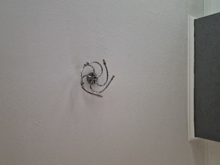 The scene is an interior view within Northampton, United Kingdom, captured from a low angle looking upwards. The dominant feature is a textured white ceiling. A chrome-finished, multi-arm light fixture is centrally mounted to the ceiling. This fixture comprises a central circular hub with five metallic, curved arms spiraling outwards. Each arm concludes with a small, brass-toned bulb socket; no bulbs are present in any socket. Below the ceiling, along the bottom edge of the frame, a segment of a dark grey wall is visible, surmounted by a white decorative coving. No people are present, and no actions or interactions are depicted.