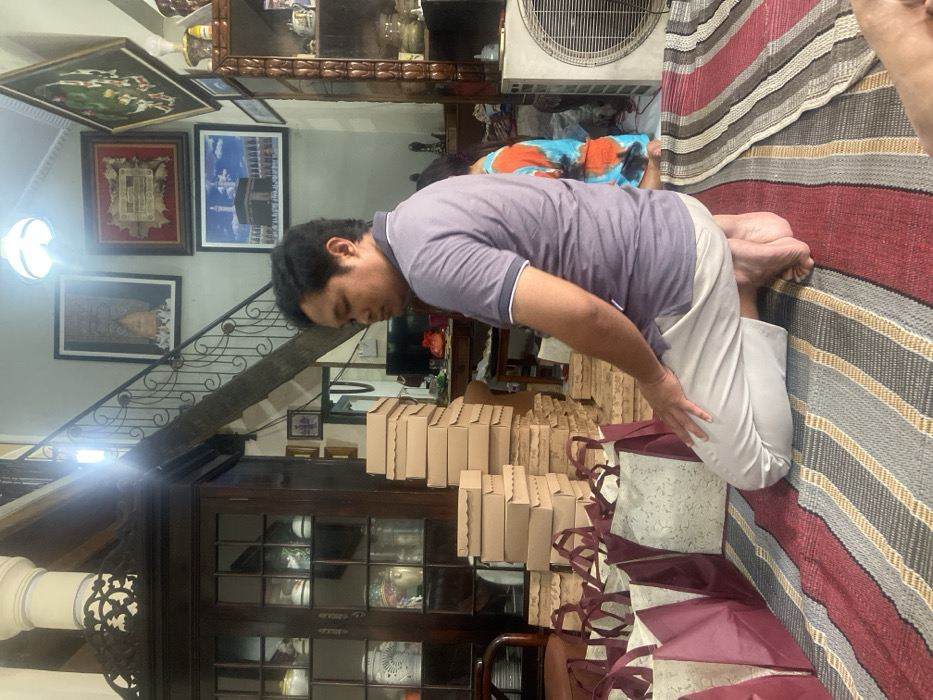 An adult male kneels barefoot on a striped mat inside a building in Mojokerto, Indonesia. He wears a purple polo shirt with white trim and light-colored trousers, facing right with his head slightly bowed. Behind him, a second individual is partially visible, seated and wearing a colorful tie-dye shirt. The immediate surroundings indicate a busy interior space. To the left of the kneeling man, a large quantity of light brown cardboard boxes with scalloped edges are stacked in multiple columns. In front of these boxes, a row of maroon and cream-colored fabric tote bags with handles are arranged on the mat. To the far left, a dark wooden cabinet with glass doors displays various items. In the background, a dark wooden staircase with decorative metal railings ascends upwards. The wall adjacent to the staircase is adorned with multiple framed pictures, including an image of the Kaaba. A bright, unshaded ceiling light fixture hangs above. To the far right, a tall, carved wooden display cabinet is partially visible, and a white standing fan is positioned on the floor. A cluttered wooden table is also visible in the mid-background.