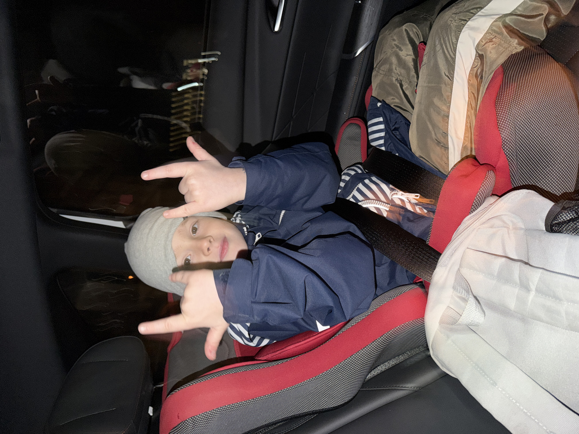 A young child wearing a gray beanie and a navy blue jacket with white stripes is sitting in a red and gray car seat inside a car. The child is making a rock-on hand gesture with both hands. The background shows blurred lights, possibly indicating an urban environment at night, likely in Krasnodar, Russia. The car's interior is visible, including black leather seats and paneling. Other items, such as jackets and a white bag, are also visible in the car.