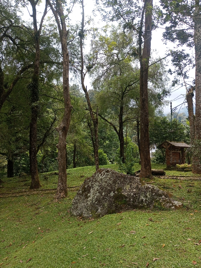 The scene depicts a park or wooded area in Padegaon, India, under bright, diffused lighting, likely from an overcast sky. A prominent, irregular grey boulder, partially covered with lichen and moss, rests in the central foreground on a gently sloping, short-cut green grass lawn. Numerous tall trees with brown trunks and dense green foliage are distributed throughout the midground and background. In the right midground, a small, rustic, dark-brown wooden structure with a sloped roof and a visible rectangular panel on its front stands near the base of a tree. An ornamental dark street lamp with multiple upward-curving arms is partially visible behind and to the left of this structure. The background consists of dense green vegetation and additional trees extending into the distance. No individuals or specific activities are observed.