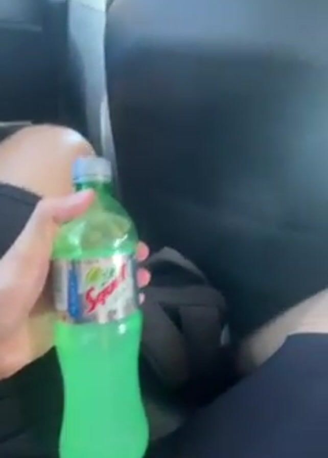 . The video shows the interior of a car with passengers, starting with a green bottle of Squirt soda in the foreground. The camera pans to show the front seats occupied by two individuals, one wearing a baseball cap and looking at a phone. Other passengers are visible in the back. The camera returns to the Squirt bottle in the hand of a passenger, and then focuses on the interior of the car once more.