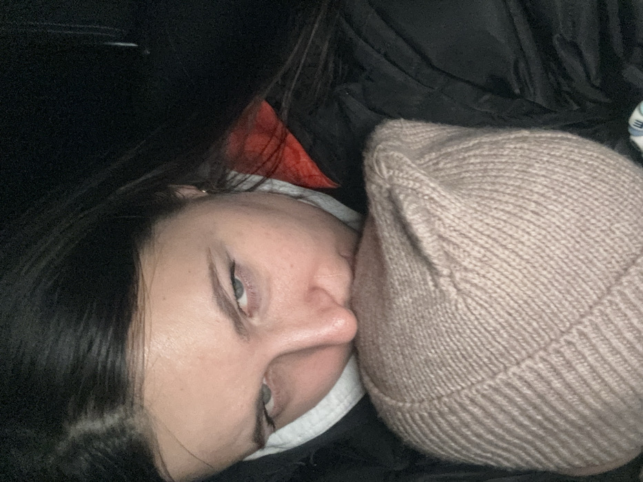 A woman lies on her side, resting her face on a beige knit beanie
