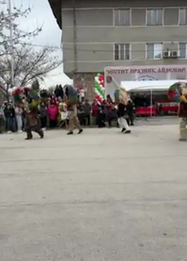 group of people in traditional costumes dancing in a town square in front of a crowd. The dancers wear furry costumes and large, colorful headdresses. Some appear to be wearing masks. Some also wear bells on their waistlines. A few people in the crowd are in traditional folk dress, while others are in modern street clothing. A banner says “Chestit Praznik, Aidemir” in Cyrillic script. The backdrop is a plain grey building with a small Bulgarian flag on display. A tent is set up next to the building. The dancers are arranged in a circle, and people play musical instruments while others dance. The square is paved with asphalt.