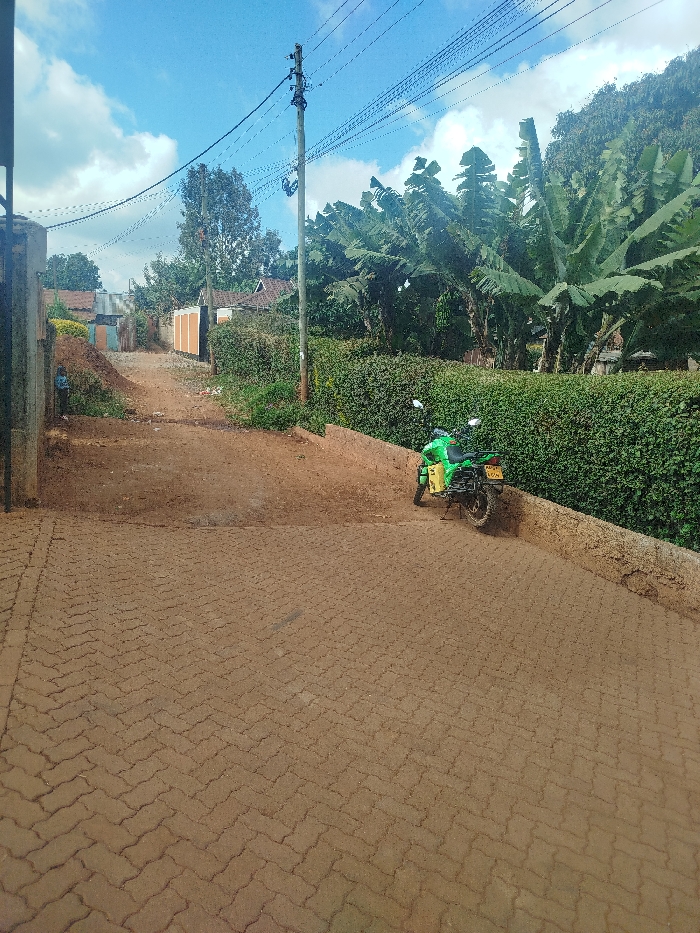 The image depicts an outdoor scene in Kihara ward, Kenya, looking uphill along a street