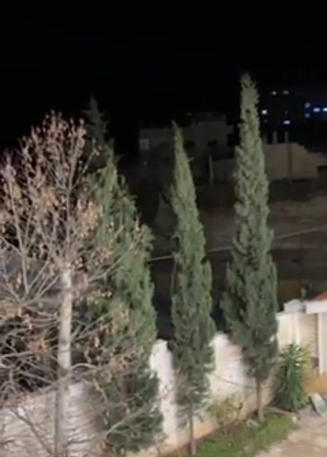 The video is taken at night, showing a view of a neighborhood with houses and trees. In the foreground, there are several tall, thin evergreen trees lined up behind a low, tiled wall. To the left, there is a bare tree with some brown leaves remaining on its branches. In the middle ground, there is a house under construction with a flat roof and some visible beams. In the background, there is a dark hill or mountain range against the night sky. There are a few distant lights from other buildings visible in the distance. The scene is quiet and still, with no visible people or movement.