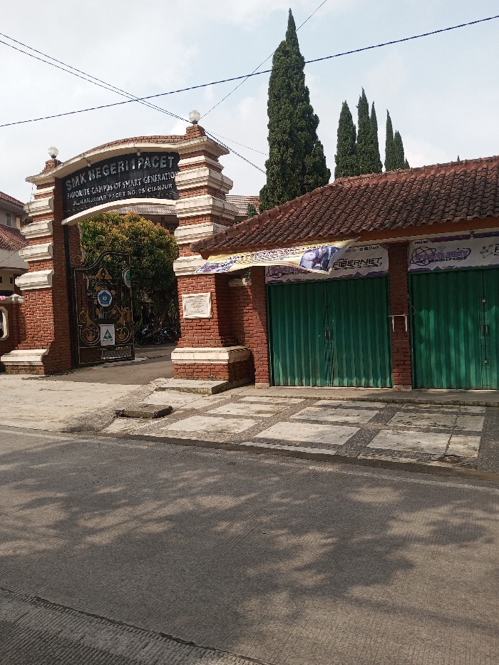 The scene is depicted in the city of Sandamal Eliya, Sri Lanka. It presents an outdoor view of a building complex entrance and an adjacent structure under a partly cloudy sky. On the left, a large, ornate entrance gate, constructed from red brick with white trim, is visible. An arched sign above the gate prominently displays the text: "SMK NEGERI PACET FAVORITE CAMPUS OF SMART GENERATION JL. HAnJUANG PACET NO. 23 CIANJUR." The dark metal gate is partially open, revealing a paved pathway and green vegetation behind it, with a dark motorcycle partially visible within the entrance. To the right of the gate, an attached single-story building features a red tiled roof and red brick walls. This building has two large, closed, dark green corrugated roll-up doors. A banner displaying graphics and text, including the word "FIBERNET," is stretched horizontally above these doors. A small, white rectangular plaque is mounted on the brick wall of this building, near the main gate. Behind this building and extending upwards, several tall, slender, dark green coniferous trees are prominent against the sky. The foreground consists of a paved asphalt road, textured with horizontal scoring marks and dappled with numerous shadows. A concrete sidewalk with large, irregular square paving slabs separates the road from the buildings. A raised, rectangular concrete block is present on this sidewalk in front of the gate entrance. Overhead utility lines traverse the upper portion of the frame. No individuals are present, and no active interactions are depicted.