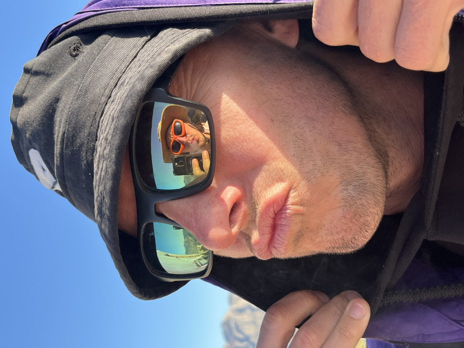 A close-up, rotated image features a person wearing sunglasses and a hooded hat against a bright blue sky. The sunglasses reflect a selfie of the same person wearing a straw hat and orange sunglasses, holding a phone. The individual's lips are pursed slightly. The hat is black with a white logo, while the hoodie appears black and purple. One hand grips the edge of the hood. Facial stubble is visible.