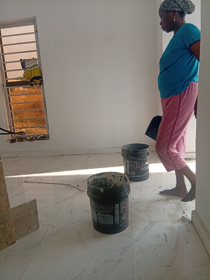 An interior room shows two black buckets on a marble-tiled floor, possibly used for painting, given the splatters. An open window with metal bars is visible in the background along with items on the other side. A woman with a headscarf and blue shirt stands to the right, holding a black object. Walls are white. The scene suggests recent or ongoing painting work.
