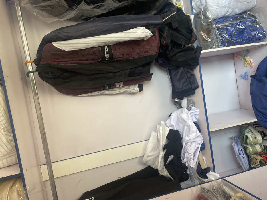 This image captures an interior scene within a facility located in Ikota, Nigeria. The space features light-colored walls and three visible horizontal shelving units. A metal clothes rail spans the upper section, supporting several jackets on plastic hangers, including a dark jacket, a maroon and white striped jacket, and a dark blue jacket. Some garments on the rail are covered by clear plastic bags. The middle shelf holds a large pile of primarily white and black clothing items on its left, and a stack of dark garments on its right. The lower-left shelf displays two pairs of athletic shoes—one light green Adidas brand, one light brown—positioned in front of folded light blue clothing. On the lower-right shelf, several plastic clothespins in blue, yellow, and pink are scattered. Adjacent to these are bundles of clothing, some encased in clear plastic bags, including one with a blue pattern and another white. A blue fabric item is partially visible at the bottom center. No individuals are present in the scene.