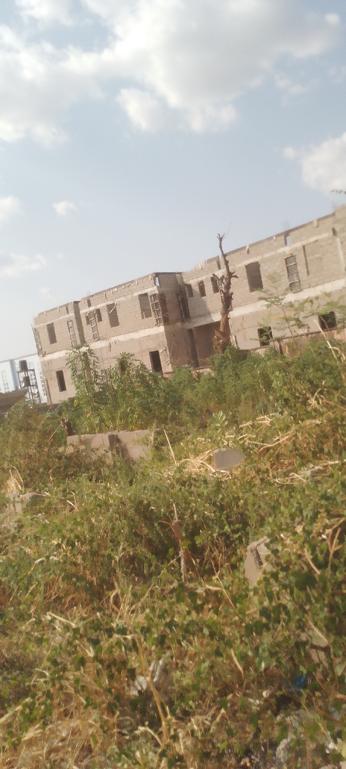 The image depicts an outdoor scene in the city of Unknown, Unknown, primarily featuring an unfinished building under a partly cloudy sky. The foreground consists of dense, overgrown green and dry vegetation, including weeds and shrubs, with scattered concrete blocks and visible refuse such as white plastic and a blue object. In the mid-ground, a multi-story structure built from light-colored concrete blocks is under construction, featuring numerous rectangular openings for windows and doors, some with visible wooden framing or scaffolding. A prominent, tall, dead tree with bare branches stands directly in front of the building, slightly off-center to the right. To the far left, partially obscured by vegetation, another lighter-colored building with a water tank on a support structure is visible. The background is a pale blue sky with scattered white cumulus clouds. No individuals are present in the scene.