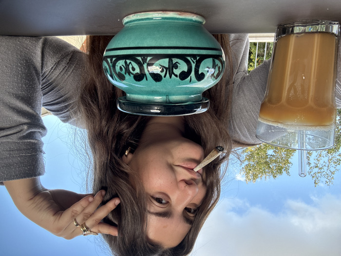 The image presents a young adult female seated at a dark surface table in an outdoor setting in Ramat HaSharon, Israel. She possesses long, dark brown hair and a nostril piercing on her left side. Her right hand, adorned with multiple gold-toned rings on the index, middle, and ring fingers, is positioned against the back of her head. A lit, hand-rolled cigarette is held between her lips. She is wearing a light grey, long-sleeved garment with a visible textured fabric. On the table to her left, a clear glass holds a light brown, frothy beverage with a transparent glass straw. Directly in front of her is a small, teal-colored ceramic pot or jar with a black lid and black decorative patterns, resembling swirls or paisley, on its exterior. The background reveals a clear blue sky with scattered white clouds, green tree foliage, and a faint white railing structure. The scene is illuminated by natural daylight.