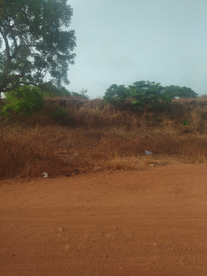dirt road in Tuoniako, Nigeria, located at latitude: 7.463, longitude: 7.157. The road is made of reddish-brown dirt and is surrounded by brown grass and bushes. A large tree with green leaves is in the foreground on the left side of the image. Further back, there is a row of trees and bushes on a small hill, with a gray sky above them. There are no people or animals in the image. A small piece of white plastic litter is visible on the ground near the road.